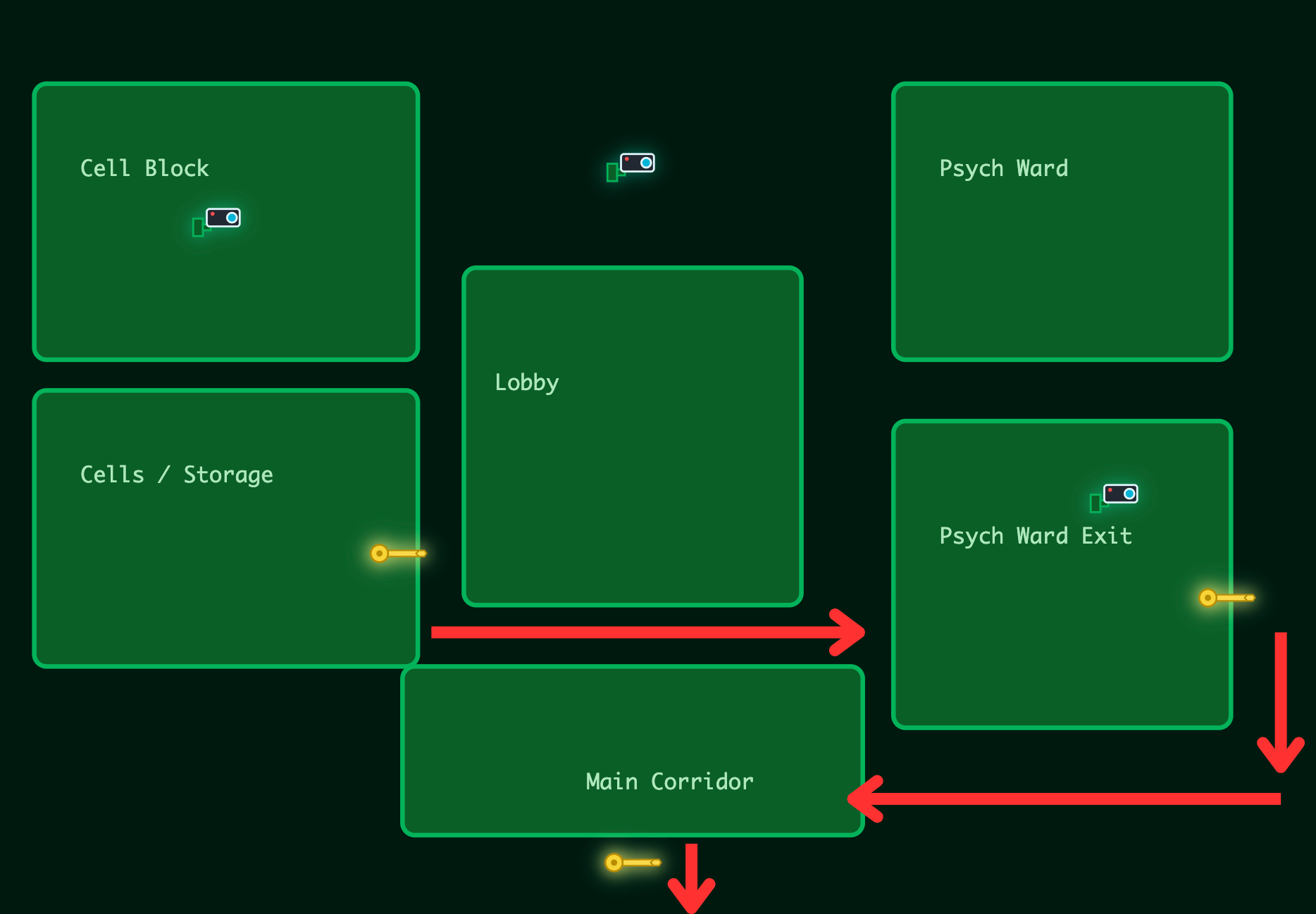- Reach the Main Corridor From the Psych Ward Exit you can move south and loop around into the Main Corridor. This is the final section of the escape route. The last challenge awaits here, and completing it will open the final exit door.