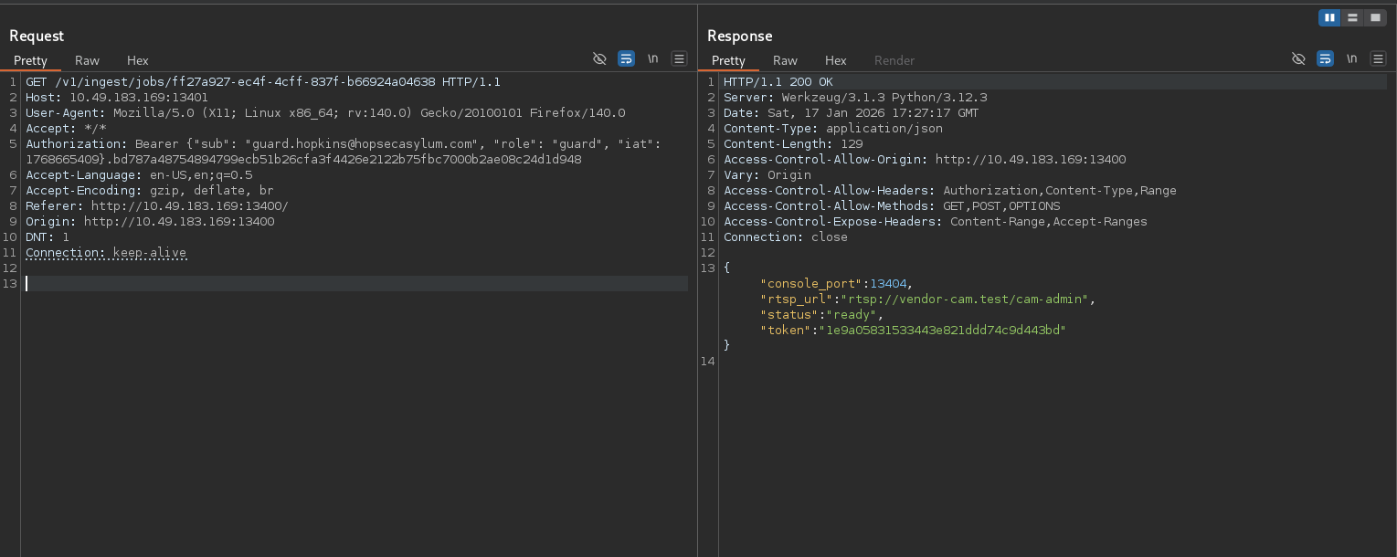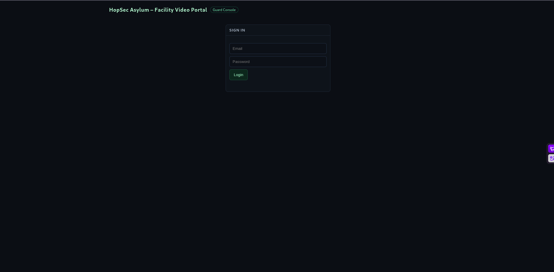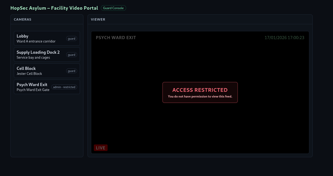 Theo gợi ý của đề bài thì để lấy được flag thứ 2 thì ta phải truy cập trang web nằm tại port 13400 ( Thông tin xác thực như bên trên ). Tuy nhiên ta không có đặc quyền để xem camera của Psych Ward Exit do yêu cầu quyền admin: