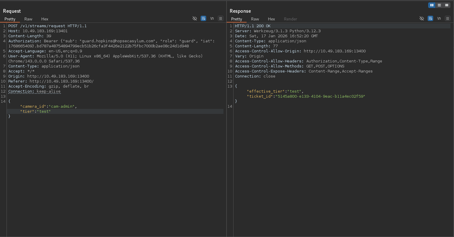 Khi ta nhấn vào 1 trong các camera trong giao diện web thì tùy thuộc vào camera mà chúng ta chọn thì nó sẽ gửi một yêu cầu POST tới /v1/streams/request chứa ID của carmera và tier của ta. Và server sẽ trả về effective_tier và ticket_id và id này sẽ được sử dụng để truy xuất video tại **/v1/streams/