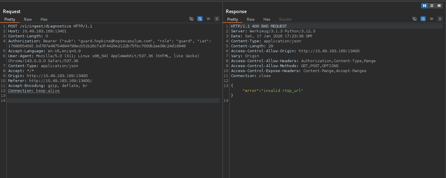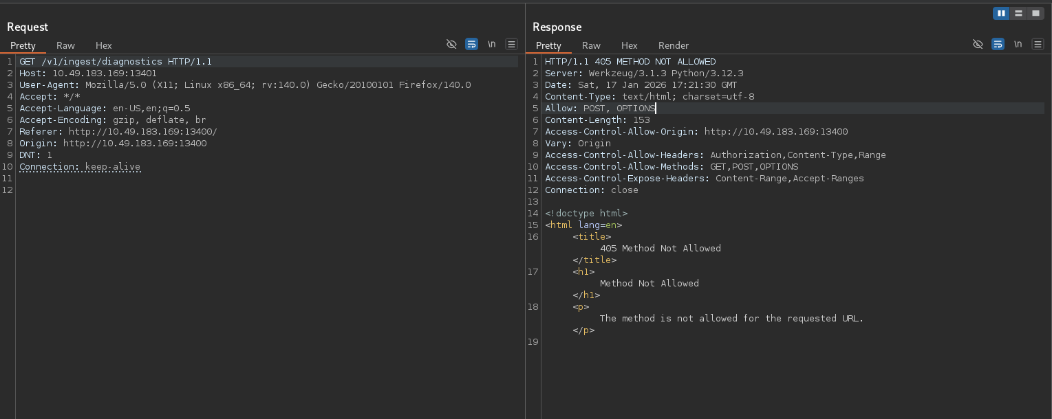 Thử sửa request đến /v1/ingest/diagnostics thì thấy không dùng được GET request mà chỉ được phép gửi request POST và OPTIONS.