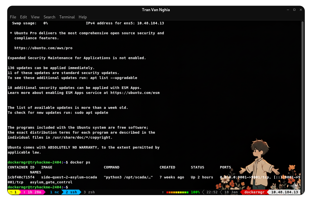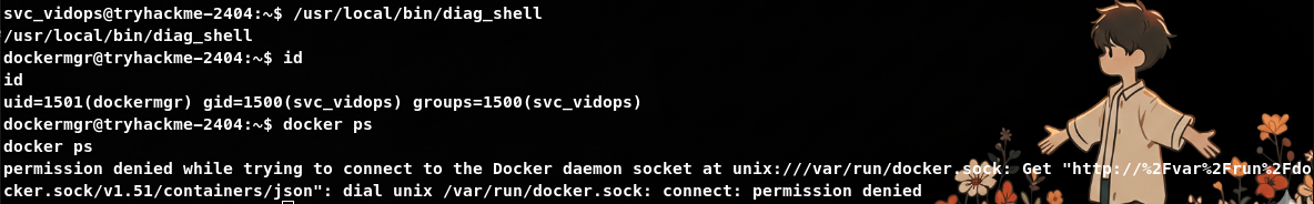 Sau khi chạy câu lệnh thì ta có được shell của dockermgr nhưng không đầy đủ quyền hạn. Do cơ chế SUID chỉ thay đổi Effective User ID (EUID) nhưng không thay đổi Group ID và chúng ta không thuộc nhóm dockermgr nên không thể thực thi các câu lệnh docker.