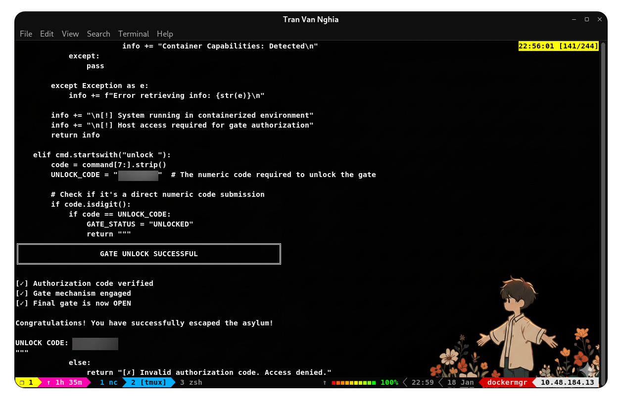 Sau khi thử các chuỗi xác thực khác nhau thì đến khi nhập flag vào input xác thực thì ta vượt qua được phần xác thực. Tuy nhiên giao diện sau xác thực cũng không mấy khả quan bởi vì câu lệnh để mở khóa terminal này cũng yêu cầu phải có một mã Code - có thể Code này cũng được dùng để lấy flag tại trang web chính.