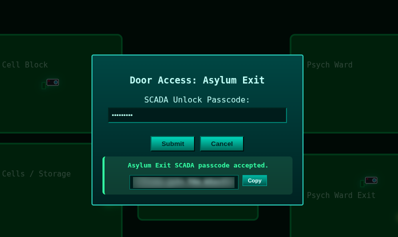 Sau khi đổi giá trị của mapscreen từ none thành block thì ta được giao diện như bên dưới. Sau đó để lấy được flag thì ta đơn giản chỉ cần nhấp vào hình chìa khóa của phòng Cell / Storage và sau đó nhấn nút Unlock Cell Door để nhận được flag: