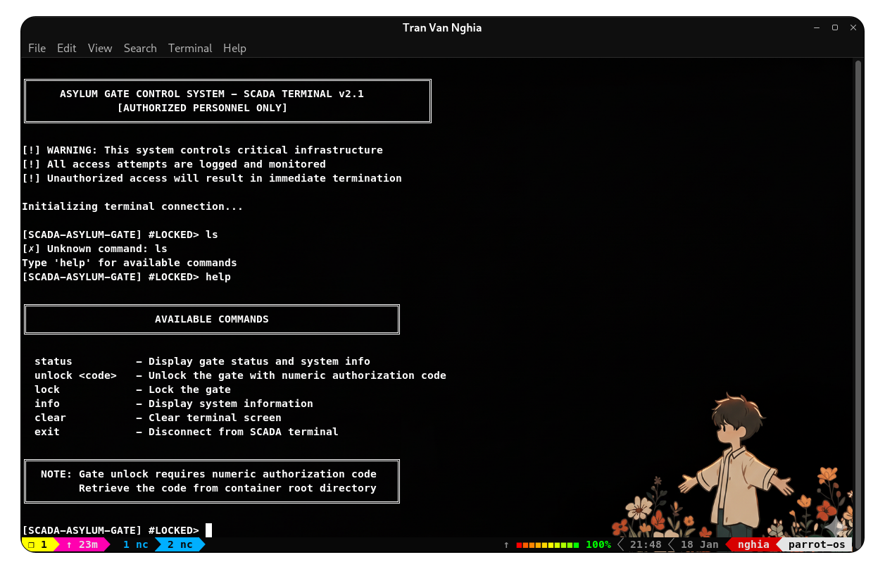 Sau khi thử các chuỗi xác thực khác nhau thì đến khi nhập flag vào input xác thực thì ta vượt qua được phần xác thực. Tuy nhiên giao diện sau xác thực cũng không mấy khả quan bởi vì câu lệnh để mở khóa terminal này cũng yêu cầu phải có một mã Code - có thể Code này cũng được dùng để lấy flag tại trang web chính.