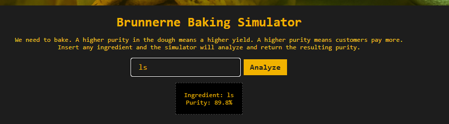 Mô tả: This new kid on the block, Bake’n’berg, has taken over the market with some new dough that has 99.2% purity. Ours is not even 60%! Our bakers have been trying to come up with a new P2P-recipe trying all sorts of weird ingredients to raise the purity, but it’s so costly this way.Luckily, the developers at Brunnerne have come up with a bash -c ‘recipe’ that can simulate the baking process. This way we can test ingredients in a simulator to find ingredients that result in a higher purity - without wasting any ressources.
