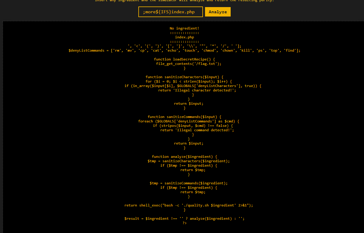 xem nó chặn những kí tự nào để từ đó dễ dàng lấy flag hơn. Nhưng đoạn code đã chặn cat