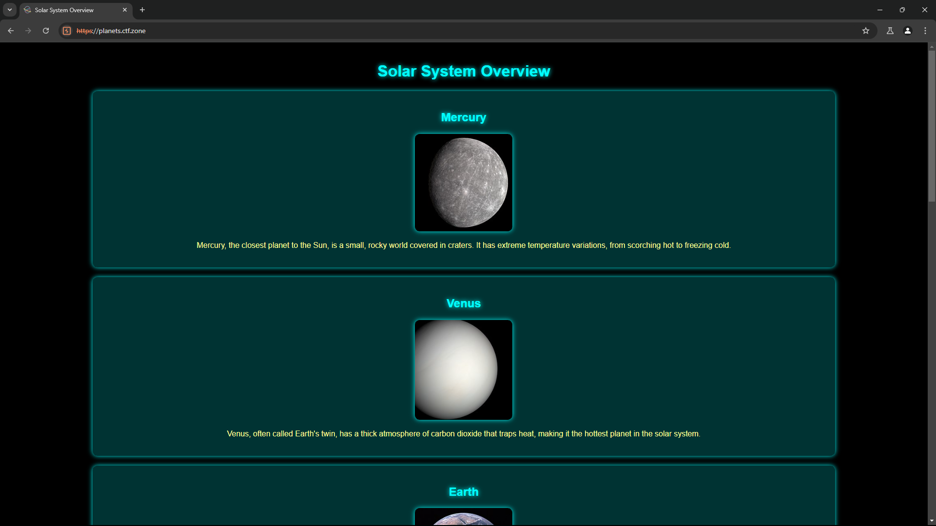 Khi truy cập vào thử thách trên thì trang web hiển thị ra một danh sách các hành tinh, ngoài ta không có thêm chức năng gì cả: