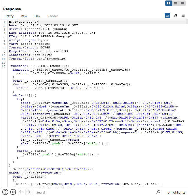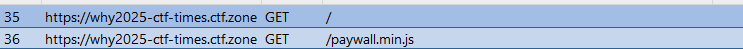 Khi ta mở trang web và bắt request trong burp suite thì bắt gặp một file paywall.min.js
