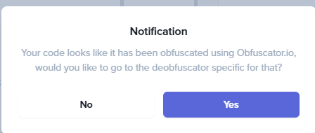 Truy cập trang https://deobfuscate.io/ để thửu gỡ rối đoạn mã, khi dán đoạn code vào input ta nhận được thông báo như sau