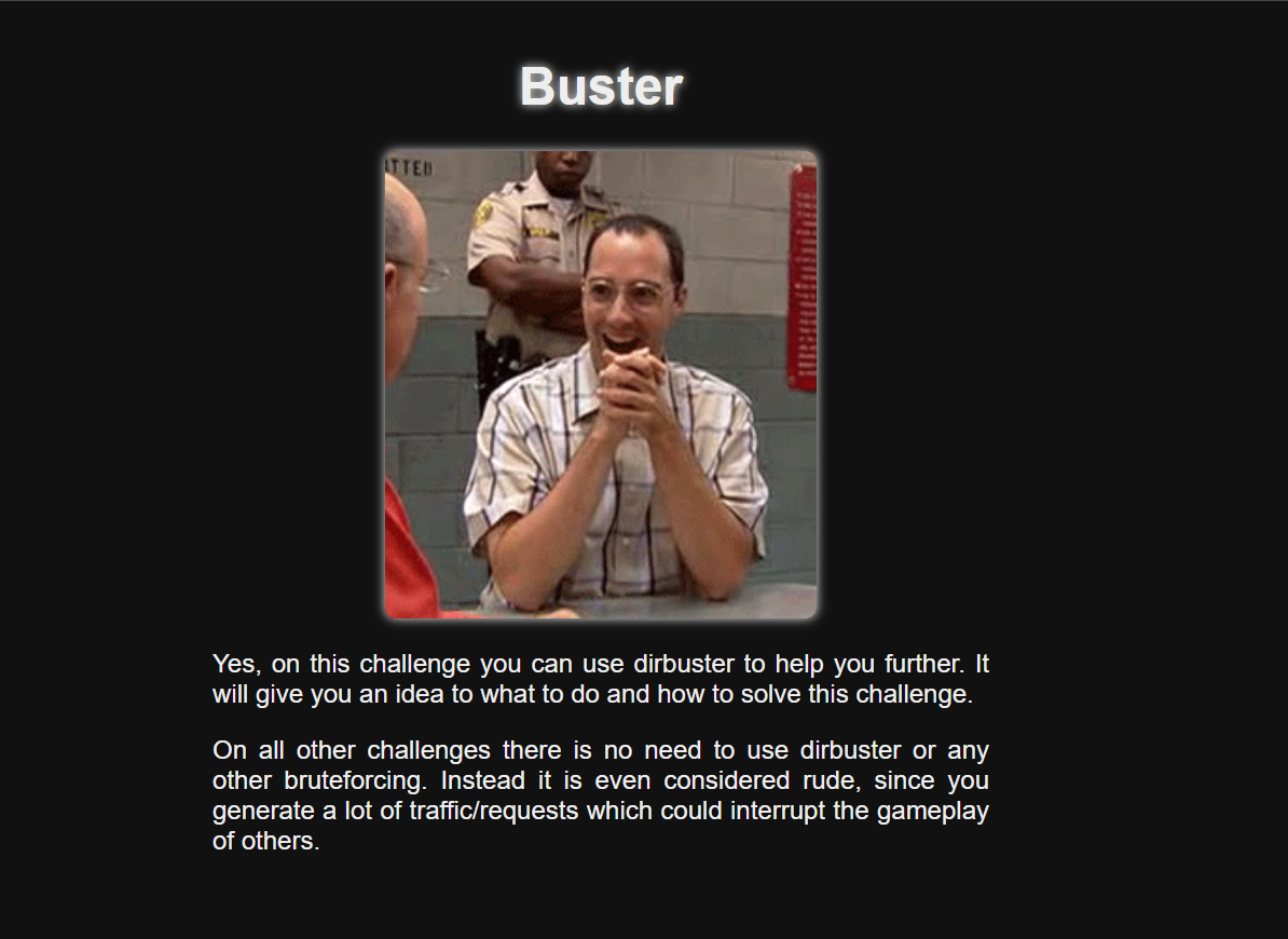 Khi truy cập vào trang web ta được giao diện như trên, đọc đoạn văn bản bên dưới tấm ảnh gif gợi ý cho ta việc dùng các công cụ để brute force các đường dẫn.