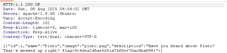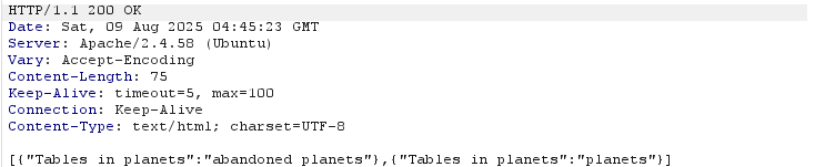 Khi ta vào burp ta thấy một lệnh SQL được gọi trực tiếp trong query để nhận về danh sách các hành tinh: