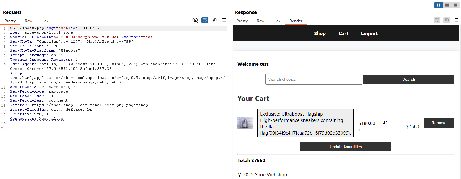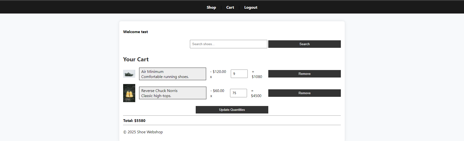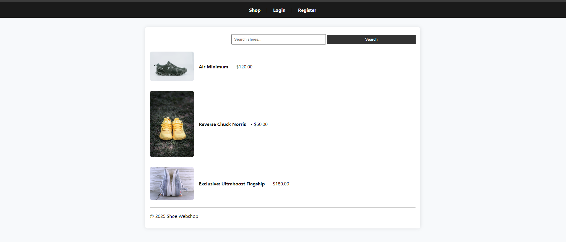 Khi truy cập trang web ta thấy một trang web có chức năng bán giày như tiêu đề của thử thách với các tính năng cơ bản.